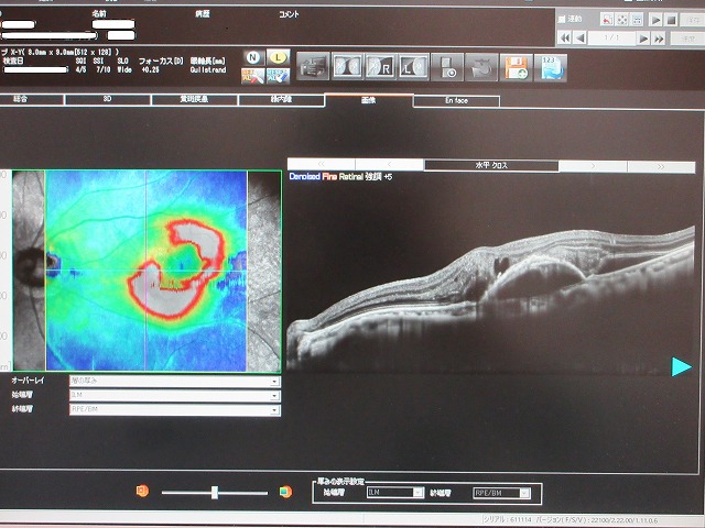 まるでCTやMRIの「眼の中版」ともいえるすごい検査機器で、放射線を使わずに光だけで肉眼では見えない網膜の構造を立体的に見ることができます。
